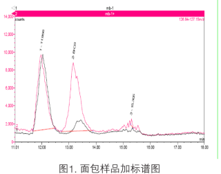 從市場和超市中選取兩種面包產(chǎn)品,上述離子色譜條件分析,所得回收率結(jié)果分別為98%和106%。樣品加標(biāo)色譜圖如圖2所示。表1為面包樣品的測定結(jié)果。由這些數(shù)據(jù)可以看出,在所檢測的兩種面包中均含有不同含量的溴酸鹽。